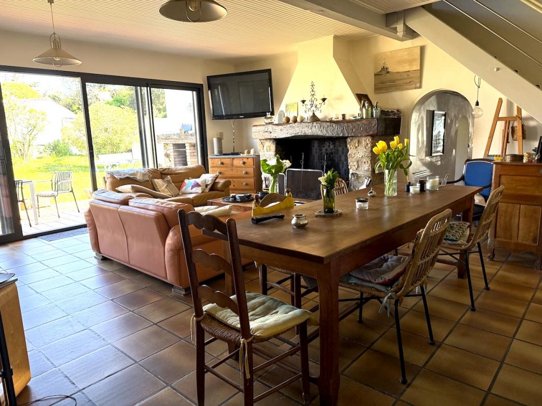 ouverte sur terrasse avec cheminée, une cuisine aménagée ouvrant également sur la terrasse,